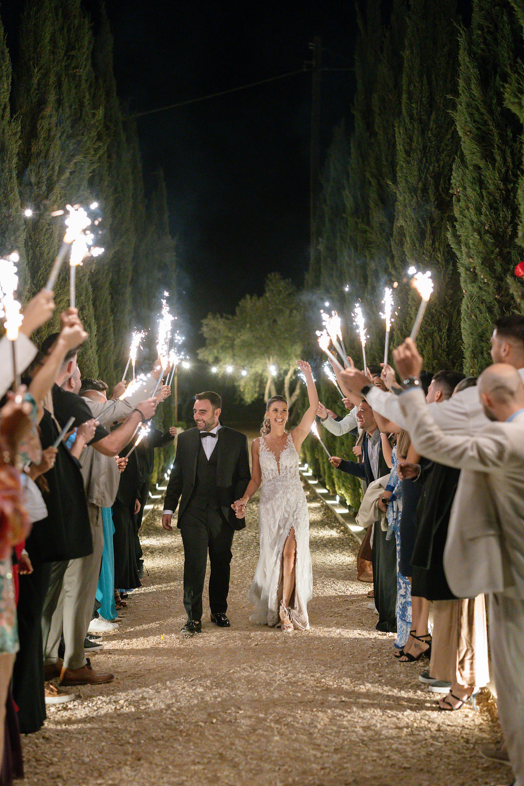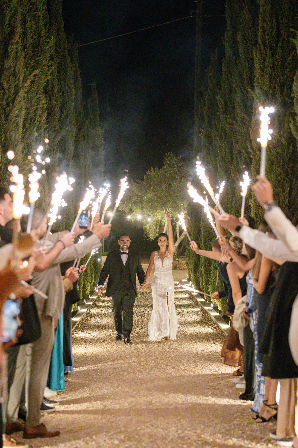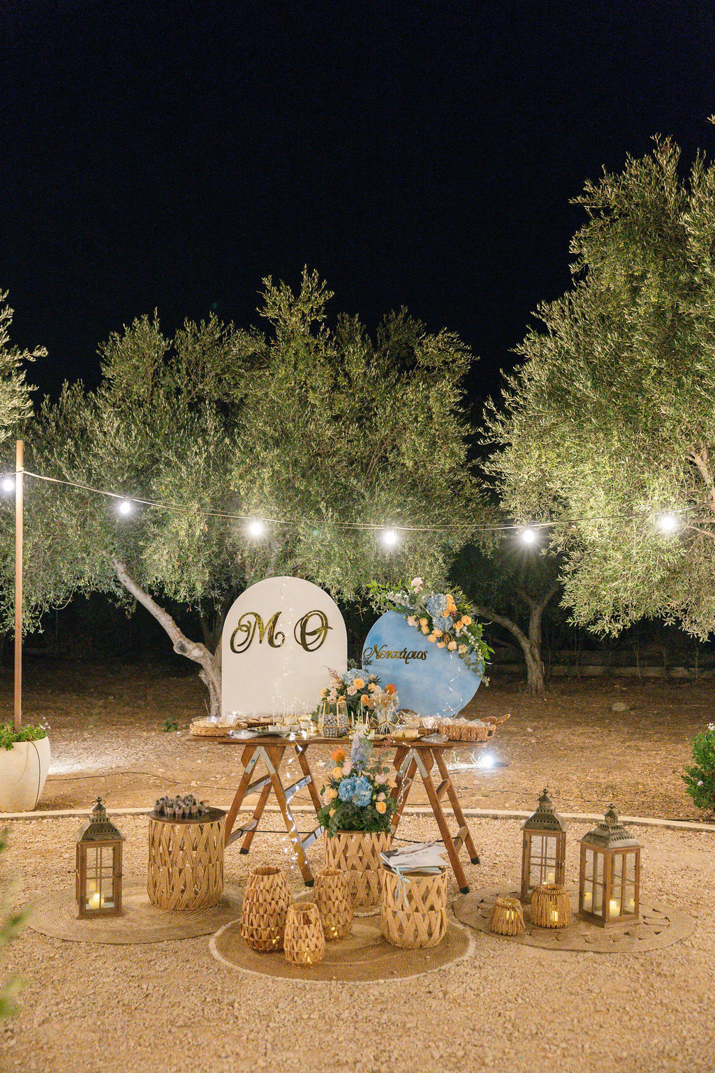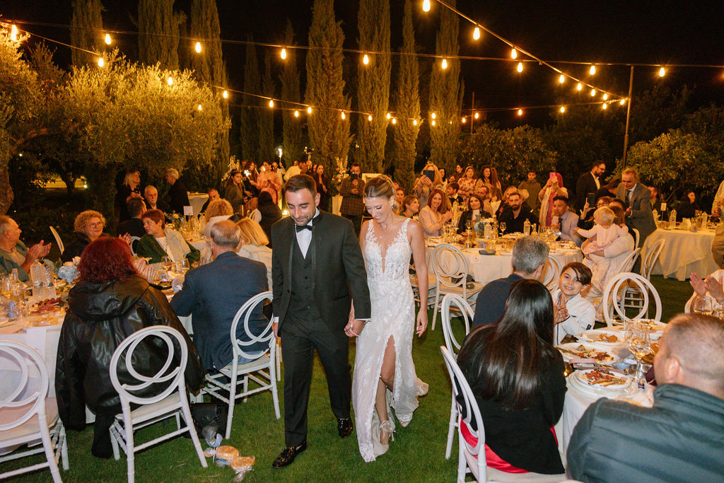 The Reception & Party: As the sun set, Cambos Estate Chania transformed. The reception took place under our spectacular Fairy-Light Canopy, a 'sky' of thousands of twinkling lights that illuminated the permanent dance floor. Our specialized Golden Grove lighting highlighted the ancient olive trees, creating a warm, magical ambiance.