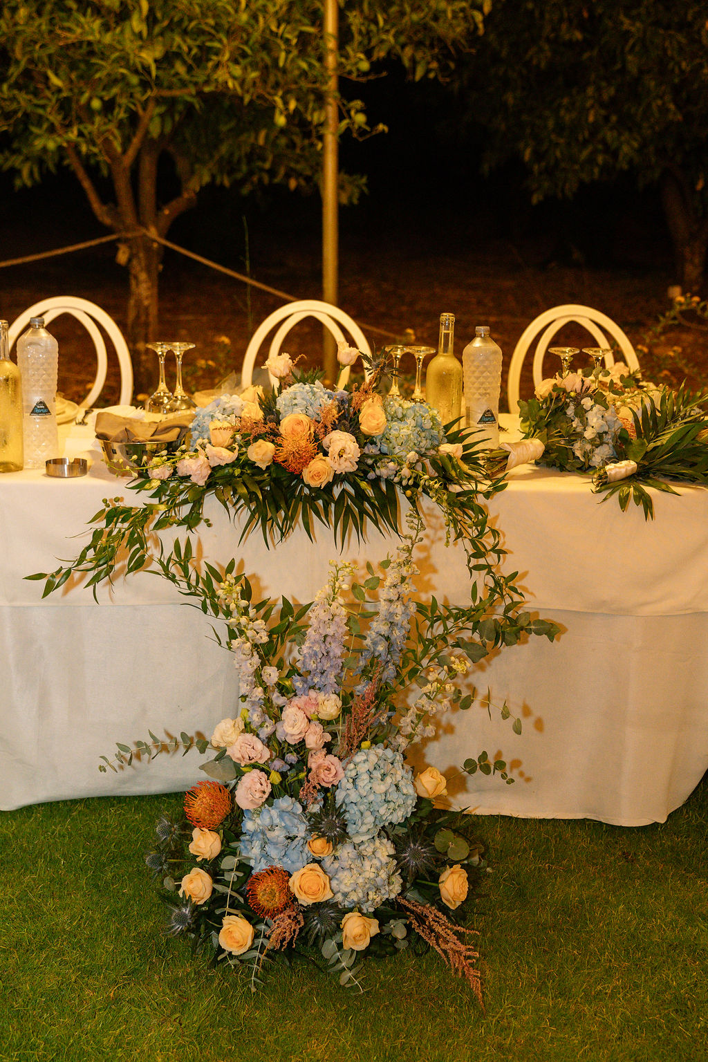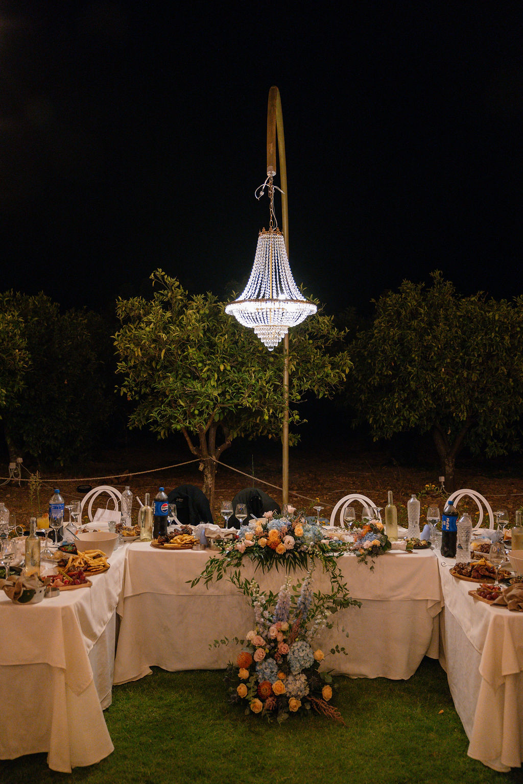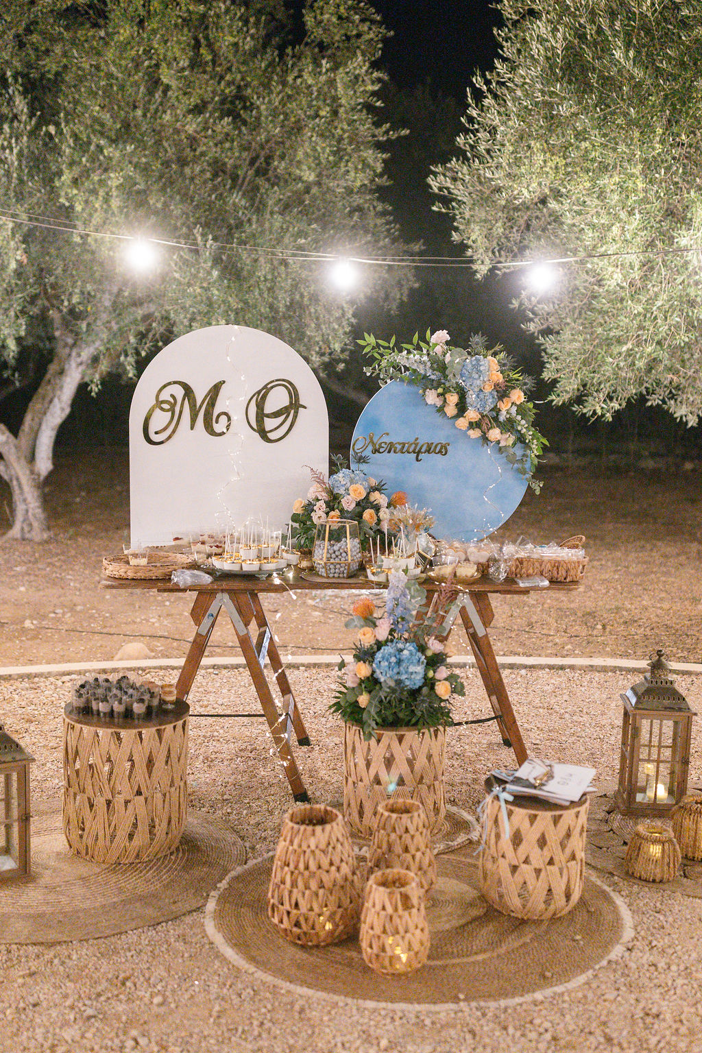 The Reception & Party: As the sun set, Cambos Estate Chania transformed. The reception took place under our spectacular Fairy-Light Canopy, a 'sky' of thousands of twinkling lights that illuminated the permanent dance floor. Our specialized Golden Grove lighting highlighted the ancient olive trees, creating a warm, magical ambiance.